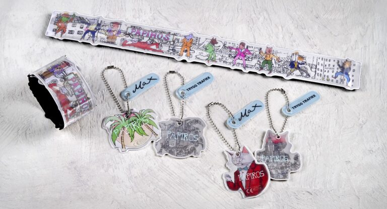 Max har laget en kolleksjon med motiver fra sitt fargerike nattklubbunivers Club Papiros, der mennesker og menneskelige dyr møtes til en evigvarende fest. Motiver med høy se-og-bli-sett-faktor – akkurat som i trafikken – der refleks handler om å se andre og selv bli sett.