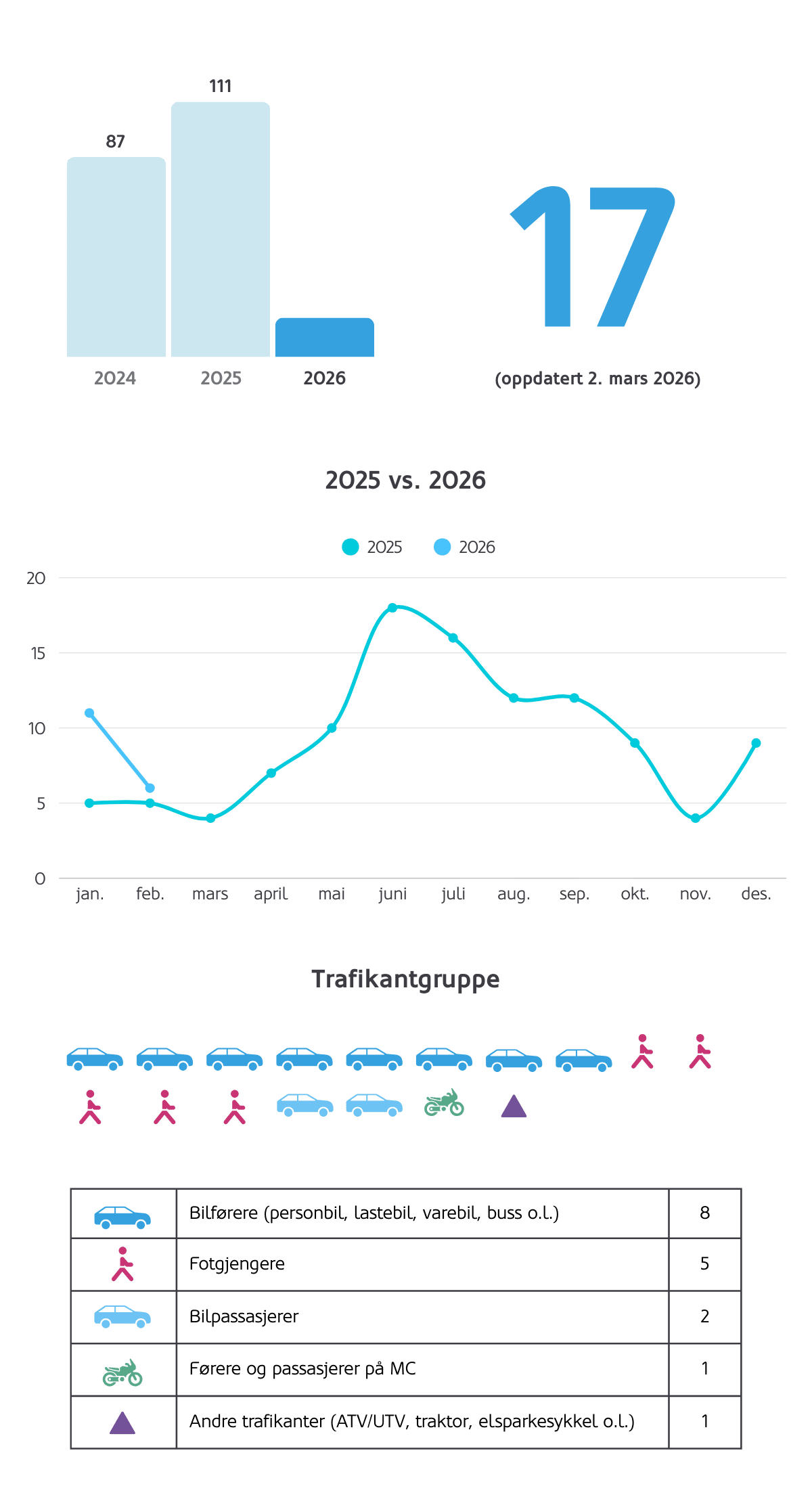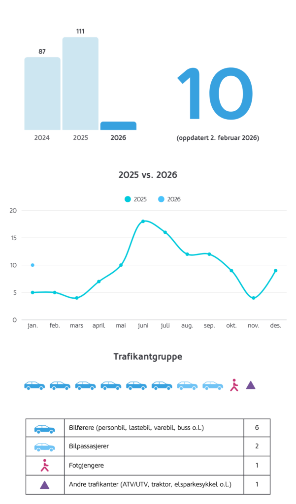 Statistikken viser dødsulykker som defineres som veitrafikkulykker (dvs. politirapporterte ulykker). Tallene er foreløpige, og vi oppdaterer én gang i måneden.