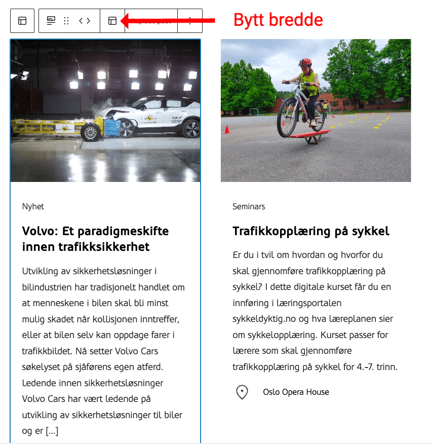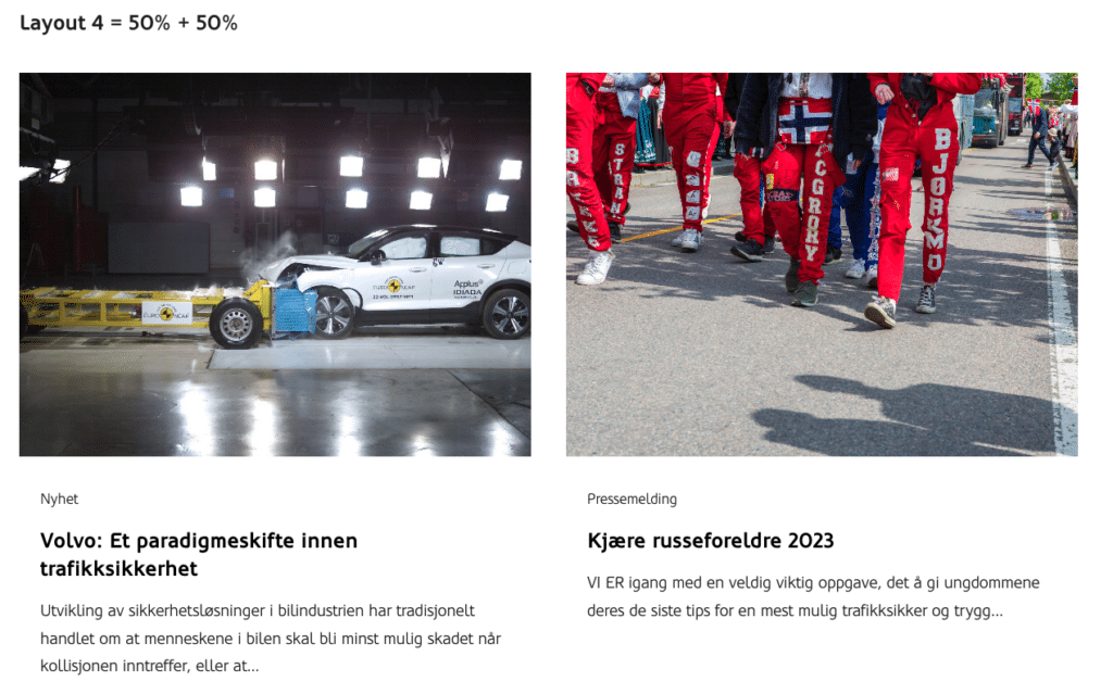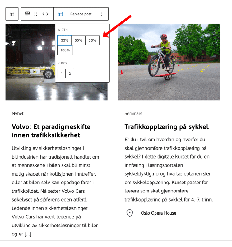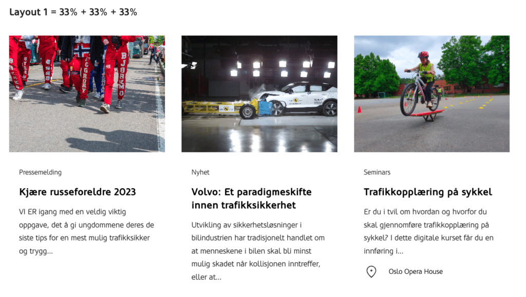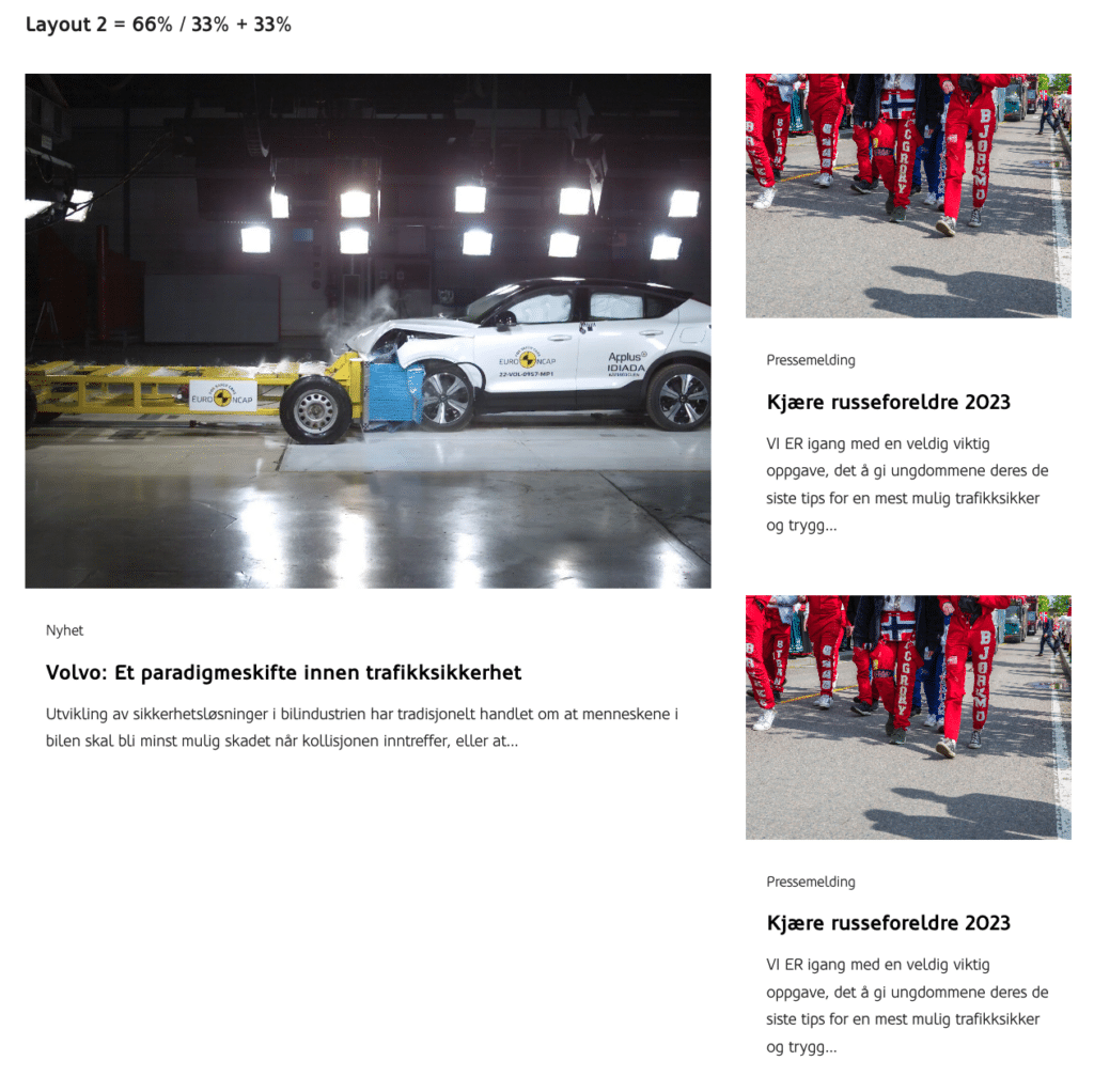 Fremhevet innholdsoppsett bruker automatisk 33 % bredde på «kortene», men dette kan redaktøren overstyre. På den måten kan det lages mer spennende layouts. For å velge bredde trykker du på «layout» knappen. Da får du opp menyen som lar deg velge ulike bredder: